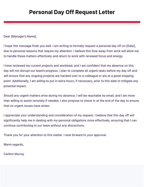 Emergency (e.g., family emergency) 3. Personal commitment (e.g., family event) 2. This straightforward template is perfect for requesting a day off without specific details.